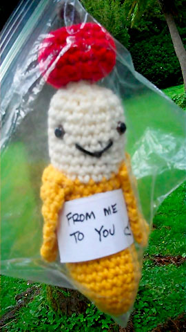 It’s been a long while since my last toy bomb/drop, so I thought I’d unleash another tiny “random act of amigurumi” on the world.