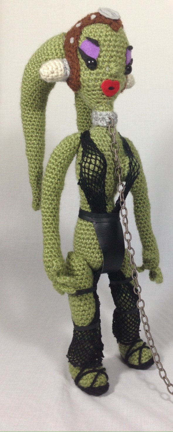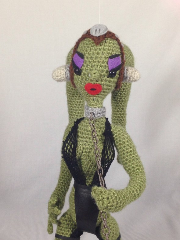 Oola has poseable arms and legs, comes with her own chain and stands about 17.5″ tall (although figure does not stand on its own). She will be on sale during the run of the show, May 14-July 9, alongside other wonderful fibrous creations from many talented and nerdy artists!