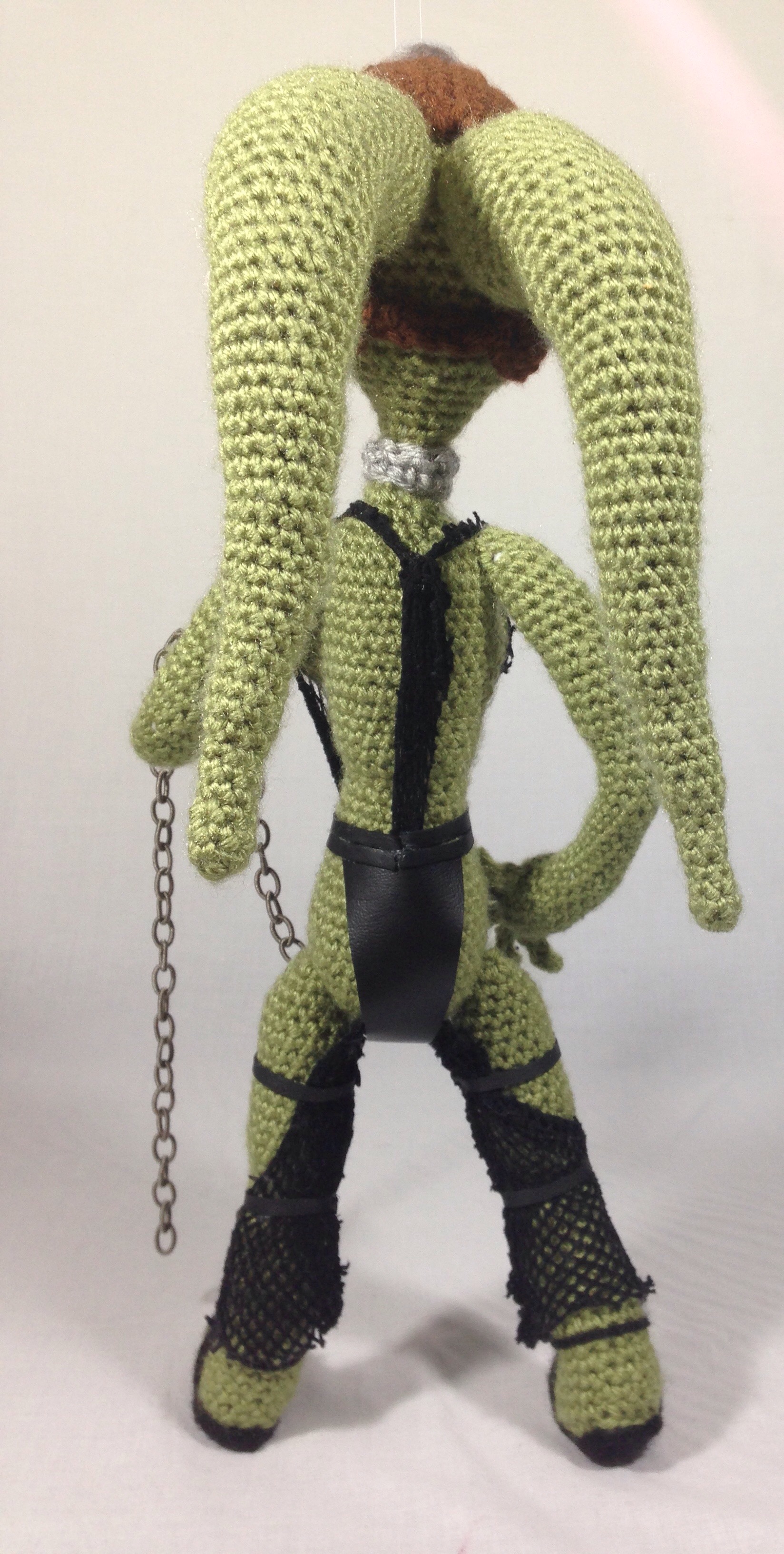 Oola has poseable arms and legs, comes with her own chain and stands about 17.5″ tall (although figure does not stand on its own). She will be on sale during the run of the show, May 14-July 9, alongside other wonderful fibrous creations from many talented and nerdy artists!