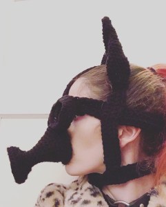 After learning about these amazing artifacts about two days prior Halloween this year, I hurriedly crocheted myself a Scold’s Bridle in about 9 hours.