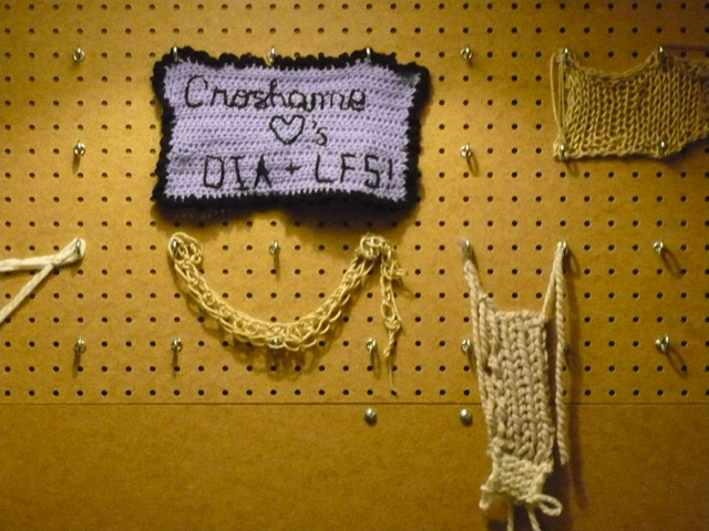 The space provided seating, knitting needles (huge ones!) and a crochet hook, with little cans of yarn and hooks on which to hang the finished work. Several people had already made and hung their donations.