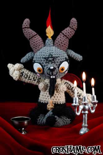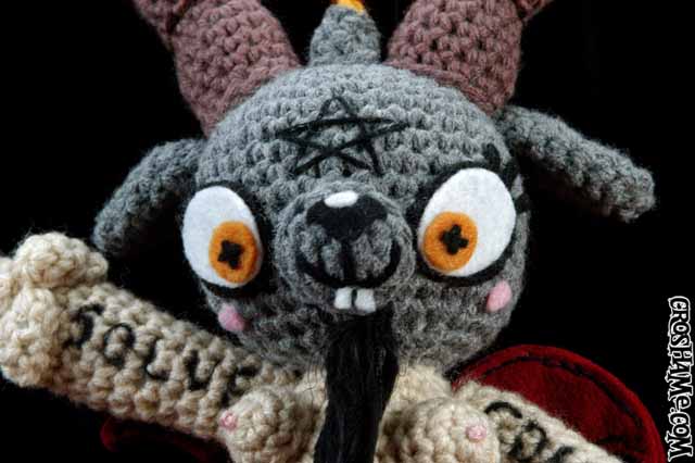Baphomet was a symbolic representation of a deity supposedly worshipped by the secretive order of the Knights Templar during the 11th century, and more recently adopted by the Church of Satan in their religious iconography. When I received a commission for a “cutesy-fied” crocheted Baphomet figure, I knew I’d seen other “Baby-Baph” type plushies by various artists before and wanted mine to be different than the others with some added Croshame flair and detail.