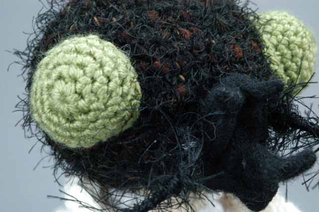 His head (which was VERY difficult to photograph accurately, by the way) was made of a crazy, fuzzy-bumpy novelty yarn I bought ages ago on a trip to Portland, OR.
