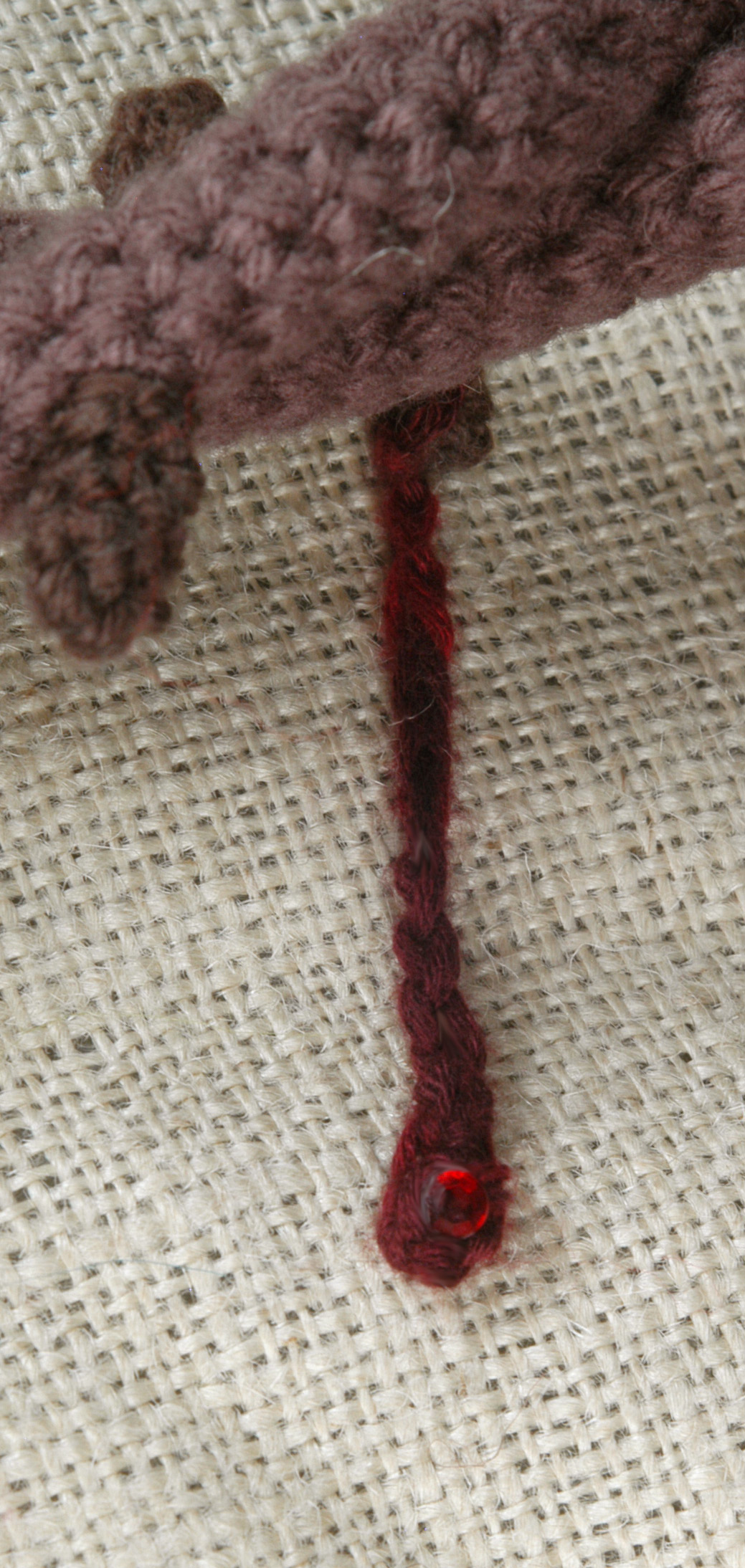 Using fabric glue, attach red crystals or beads to either side of “drop” (on the hdc).