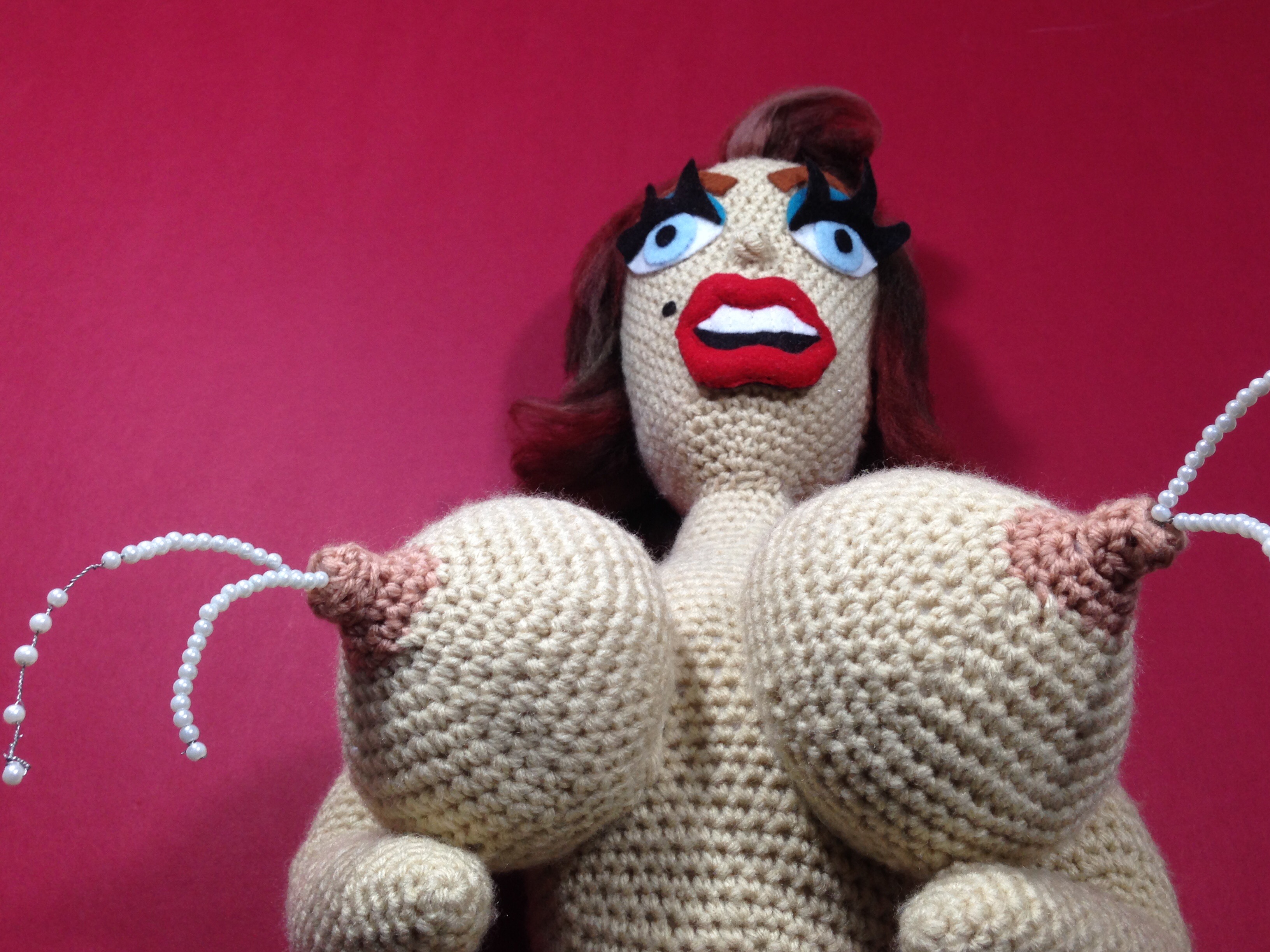 Kembra was really excited about her crocheted likeness and very kindly invited me to be in her upcoming show in London at the Emalin Gallery, where she was displaying collaborations and portraits by artists such as Richard Kern, Mike Diana, Scott Ewalt, Katrina Del Mar and many others, as well as her own sculptures, drawings and performance pieces. I made an additional figure just for the show at Kembra’s request, a red version of the Voluptuous Horror Kembra that was a little more interactive and could be made to do several of her known performance pieces.