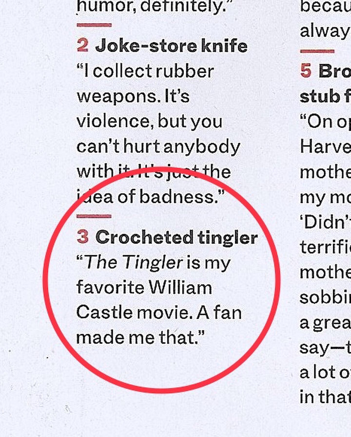 When I asked him to sign it, his face brightened. “Oh, yes! I was hoping you’d see that! You know that’s not the way my house really looks,” John told me, “That desk setup is fake; I just put a bunch of my favorite things out and they came over and took pictures.” He repeated how very glad he was that I came across the magazine, and told me he keeps his Croshame Tingler “proudly displayed” in his home with his other life-size plastic Tingler movie replica from his collection.